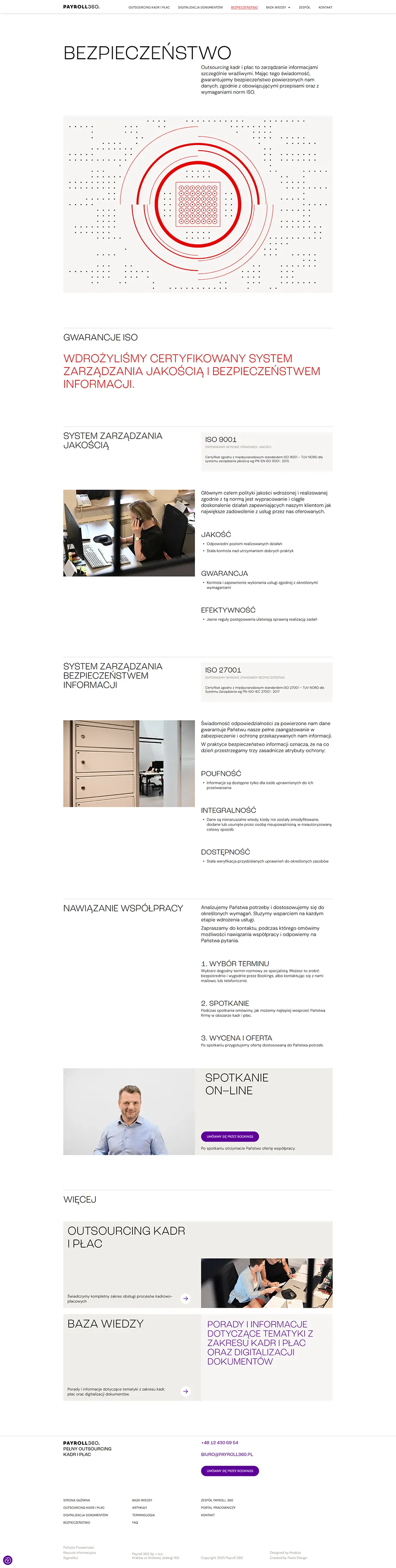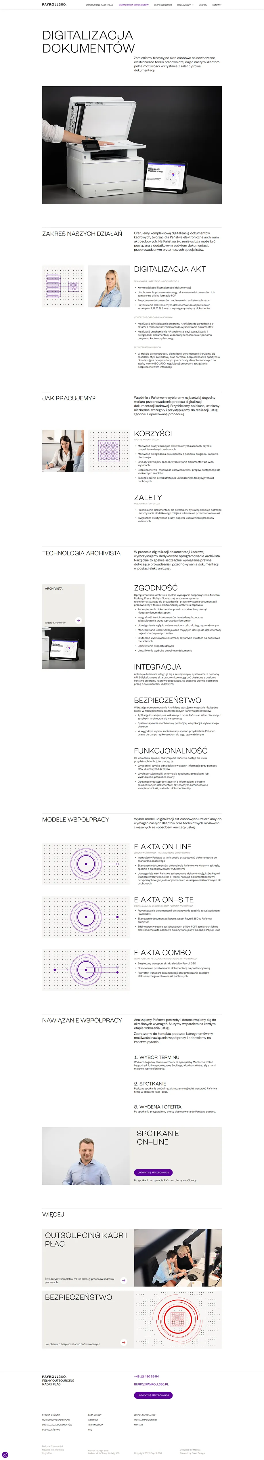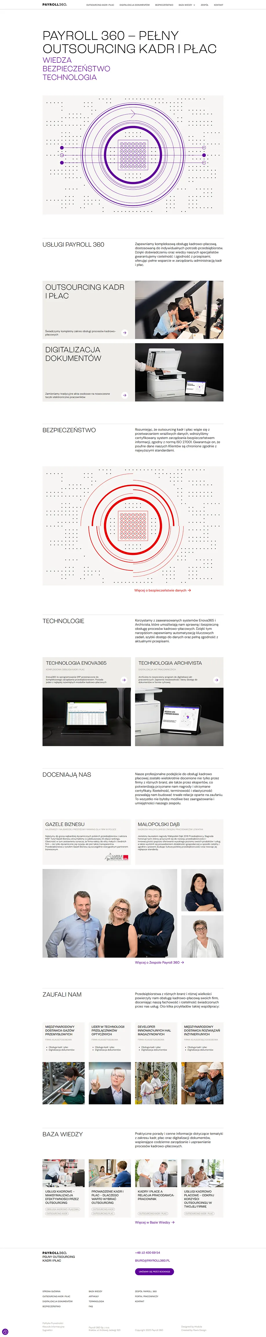 Strona internetowa prezentująca ofertę firmy Payroll 360, w zakresie outsourcingu kadr i płac oraz digitalizacji dokumentów.